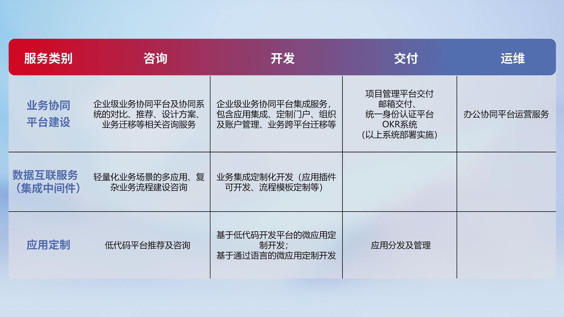 针对钉钉、、、企微、、、、IDaas等平台级产品提供产品的规划、、、方案、、交付、、、定制化开发等服务,,,,实现如统一协同办公、、、智能客户服务、、、、混合会议管理、、、、智能数据查询、、等业务场景,,实现数字化转型。。。。